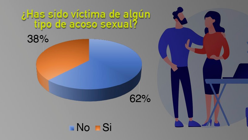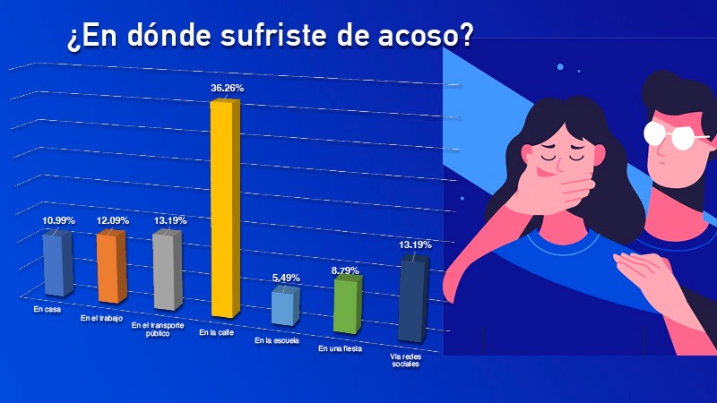 En esta ocasión, la agencia Ícono Publicidad y Comunicación muestra que un 38 %, es decir, dos de cada cinco personas, ha sufrido un tipo de acoso. Encontrando que este se da mayormente en la calle, espacios públicos y en el ámbito laboral; seguido de fiestas, vía redes sociales y en sus propios hogares.